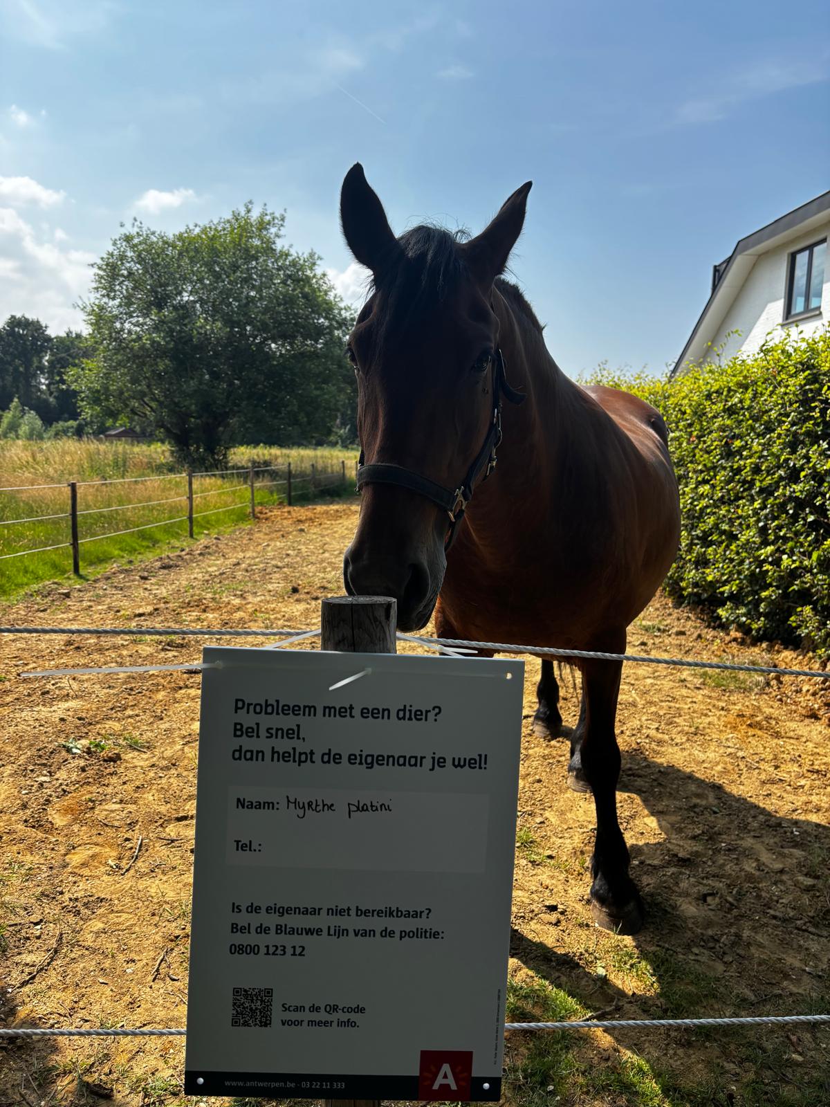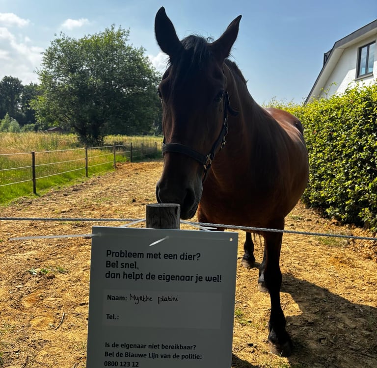 Voorbijgangers, fietsers of wandelaars zijn vaak de eersten die merken dat een dier hulp nodig heeft. Zoals bijvoorbeeld een schaap dat vastzit in de omheining, een ontsnapte geit of een gewond paard. Dankzij de borden met contactgegevens aan de weide kunnen zij meteen de eigenaar verwittigen. Is die niet bereikbaar, dan kunnen ze de Blauwe Lijn van de politie bellen, dat ook op het bord vermeld staat.